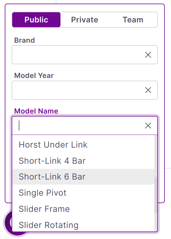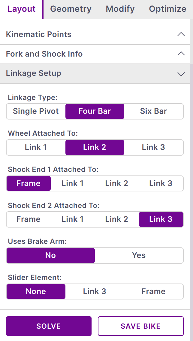 Once the linkage type is selected the attachments can be made. Non-linkage components such the shock, wheel, and idler can be attached to any member. When changing between linkage types double check all attachments are changed to insure a valid solution.