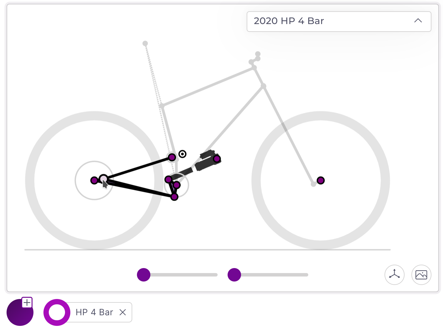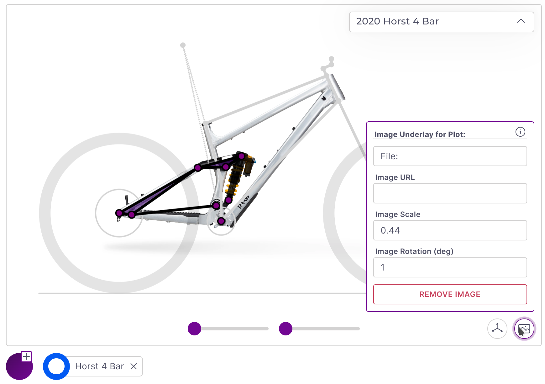 To model a linkage from an image open the Image Overlay panel using the icon in the bottom right of the bike plot. An image can be uploaded or linked from a URL. Generally the chainstay length or shock length is a good reference for image scale. Once the image is scaled properly you can use the zoom and drag features to position points as accurately as possible.
