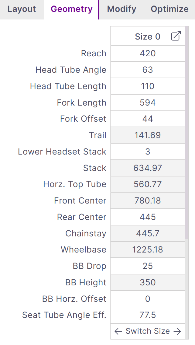 If you want to look at the differences between multiple sizes the expanded geometry chart can opened using the Popout icon in the top right. The active size will always be shown in the sidebar and is the size used for the kinematic computation.