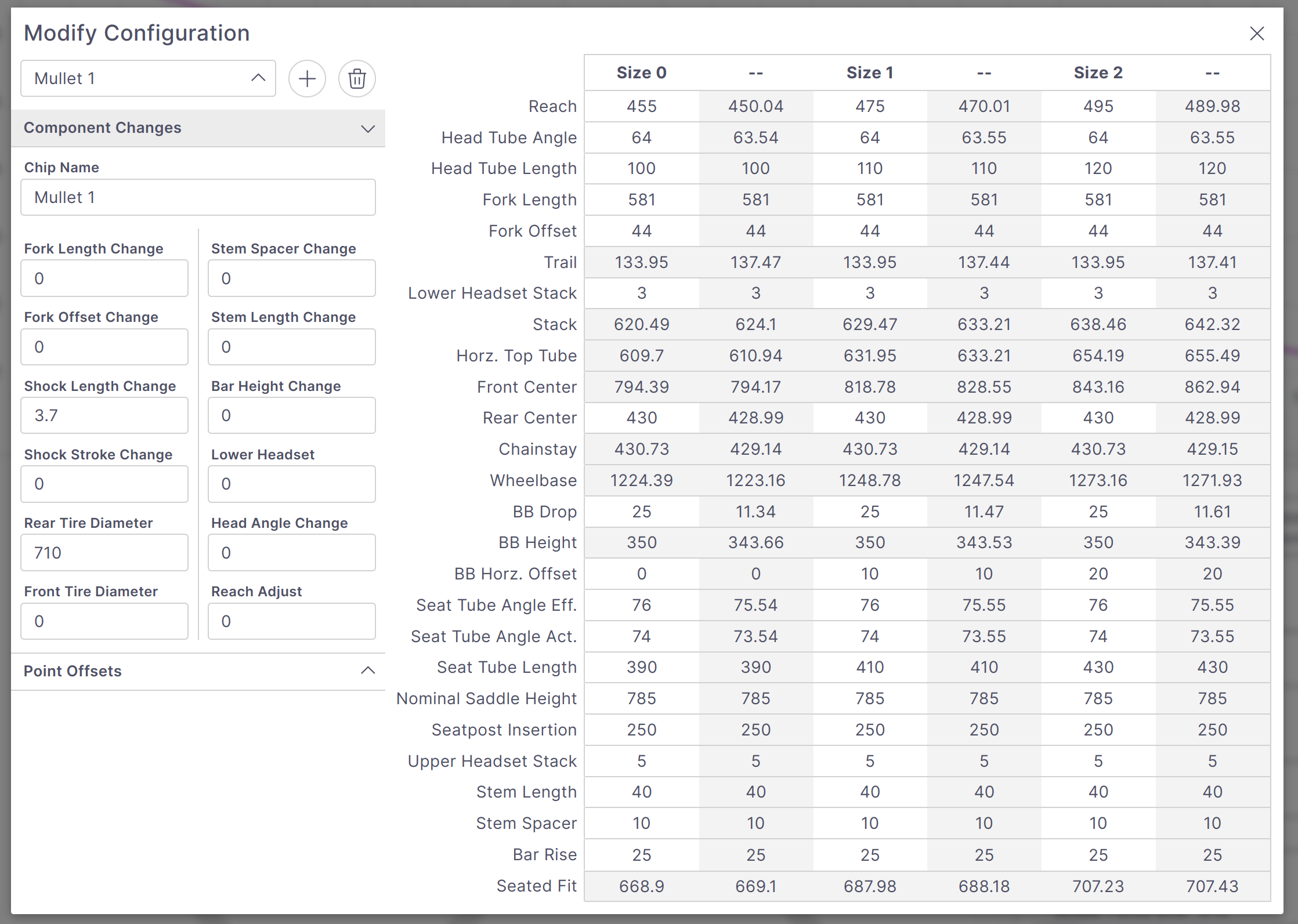 Complete geometry tables for the chip configurations can be viewed by clicking Geo Analysis from the Modify tab. As flip chip configuration parameters are changed the resulting geometry will be updated instantly. The bikes nominal geometry parameters can also be adjusted here identically to the table accessible from the Geometry tab.