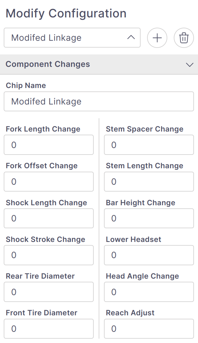 Each chip configuration is composed of a complete set of linkage point-offsets and bike modifiers. Bikes can have multiple chip configurations to store different chip settings or bike setups. A chip can loaded from the Chip Selection dropdown or a new chip can be created by clicking New.